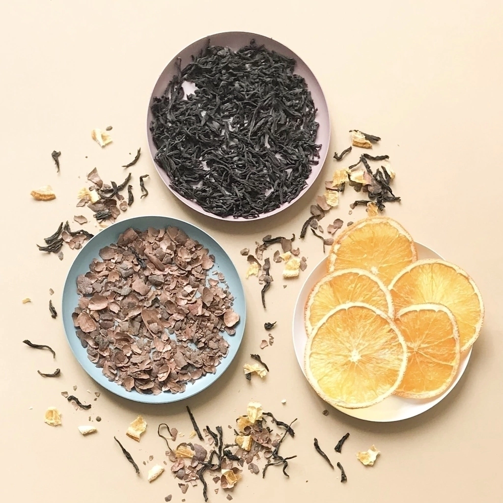 Hebras de té negro de Ceylón, trocitos de naranja y cascarilla de cacao. Perfumado con unas gotas de aceite esencial de naranja. Cacao y naranja en un equilibrio perfecto.